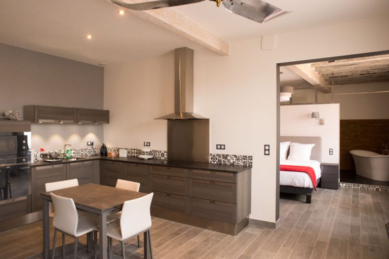 Dans chaque appartement vous trouverez un salon avec une cuisine ouverte toute équipée et une chambre avec salle de bain ouverte équipée d’une baignoire et d’une douche italienne. Les salons sont équipés de canapés convertibles.