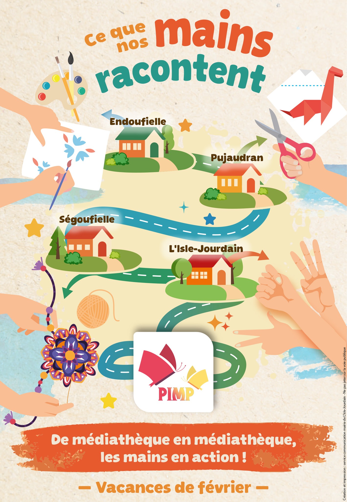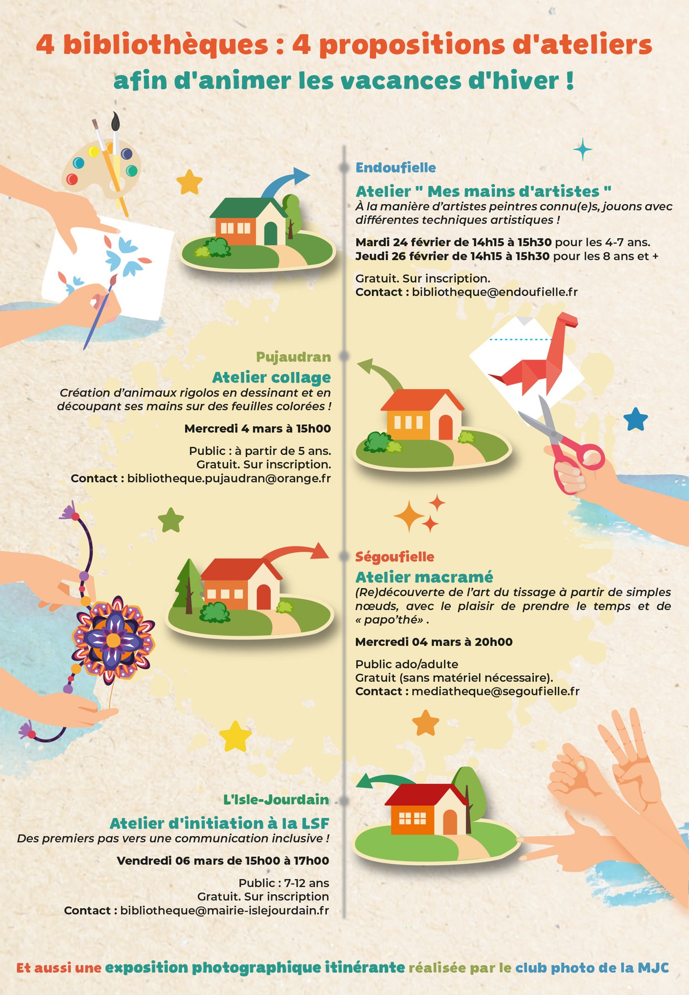 Ateliers artistique proposées à la médiathèque de Pujaudran pendant les vacances d’hiver! -Atelier collage: création d’animaux rigolos en dessinant et en découpant ses mains sur des feuilles colorées. Mercredi 04 mars à 15h, à Pujaudran. -Atelier « mes mains d’artistes »: à la manière d’artistes peintres connu(e)s, jouons avec différentes techniques artistiques. Mardi 24 février et jeudi 26 février de 14h15 à 15h30, à Endoufielle. -Atelier macramé: (re)découverte de l’art du tissage à partir de simples nœuds, avec le plaisir de prendre le temps de « papo’thé ». Mercredi 04 mars à 20h, à Ségoufielle. -Atelier d’initiation à LSF: des premiers pas vers une communication inclusives. Vendredi 06 mars à 17h, à l’Isle-Jourdain. Pensez à vous inscrire.