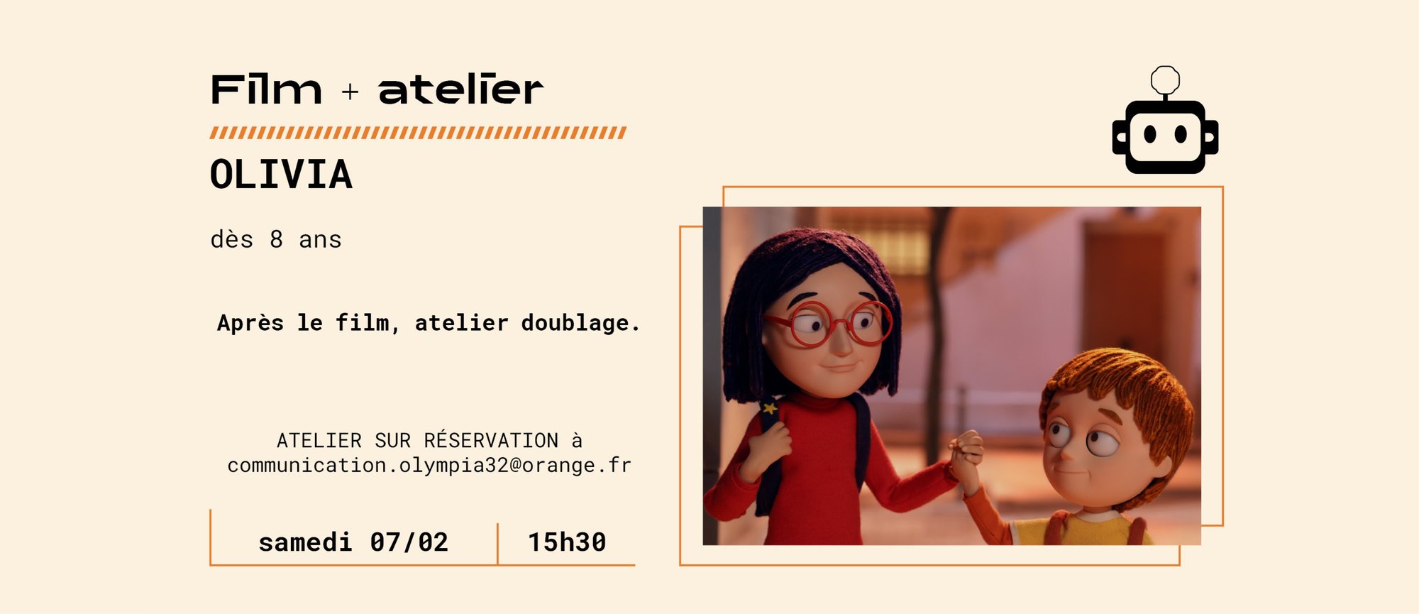 Un atelier doublage est proposé après la diffusion du film « OLIVIA » par Irene Iborra. A partir d’une petite séquence du film, les enfants (et les plus grands s’ils le souhaitent) seront invités à refaire les voix des personnages.