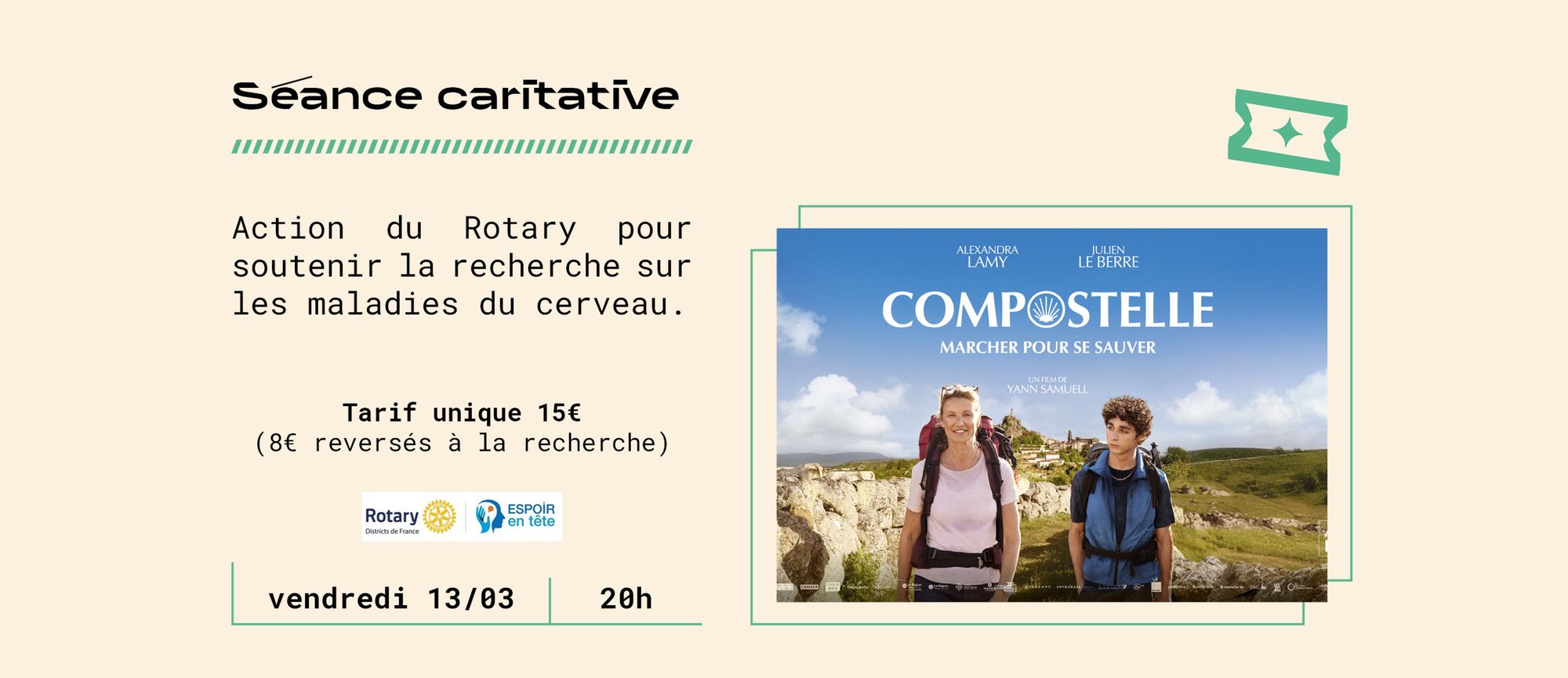 Découvrez en avant-première COMPOSTELLE. Cette séance est caritative : tarif unique à 15€ (8€ seront reversés à Espoir en tête pour l’achat de matériel de haute précision à des chercheurs pour la recherche sur le cerveau).