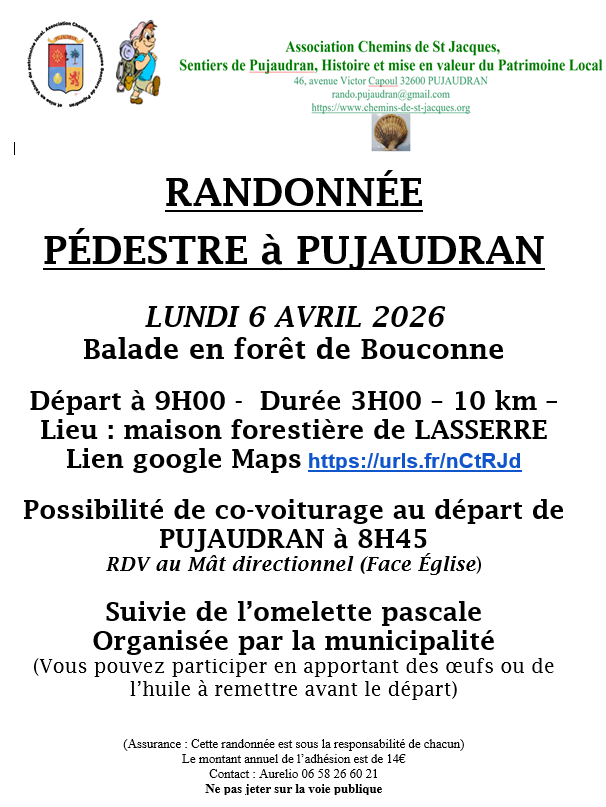 Rendez-vous à 9h, le départ aura lieu devant le mât directionnel (face à l’église) . Au programme : une balade conviviale de 10 km, environ 3 heures de marche afin d’ être de retour aux environs de 12H pour la dégustation de l’omelette pascale organisée par la mairie de Pujaudran.