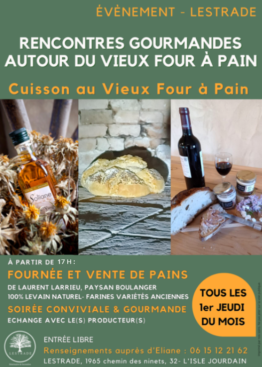 Avec Laurent, notre talentueux paysan boulanger, découvrez les secrets de la fabrication artisanale du pain dans notre vieux four traditionnel. Laissez-vous envoûter par les arômes alléchants qui se répandent dans l’air et plongez dans l’atmosphère chaleureuse à Lestrade. Après avoir admiré la magie de la cuisson, régalez-vous lors d’un moment gourmand autour du bon pain et même un bon repas préparé par la propriétaire des lieux ! Que vous soyez passionné de gastronomie, curieux de découvrir nos traditions ou simplement à la recherche d’un moment de convivialité, cette après-midi est faite pour vous ! Dès 17 h.