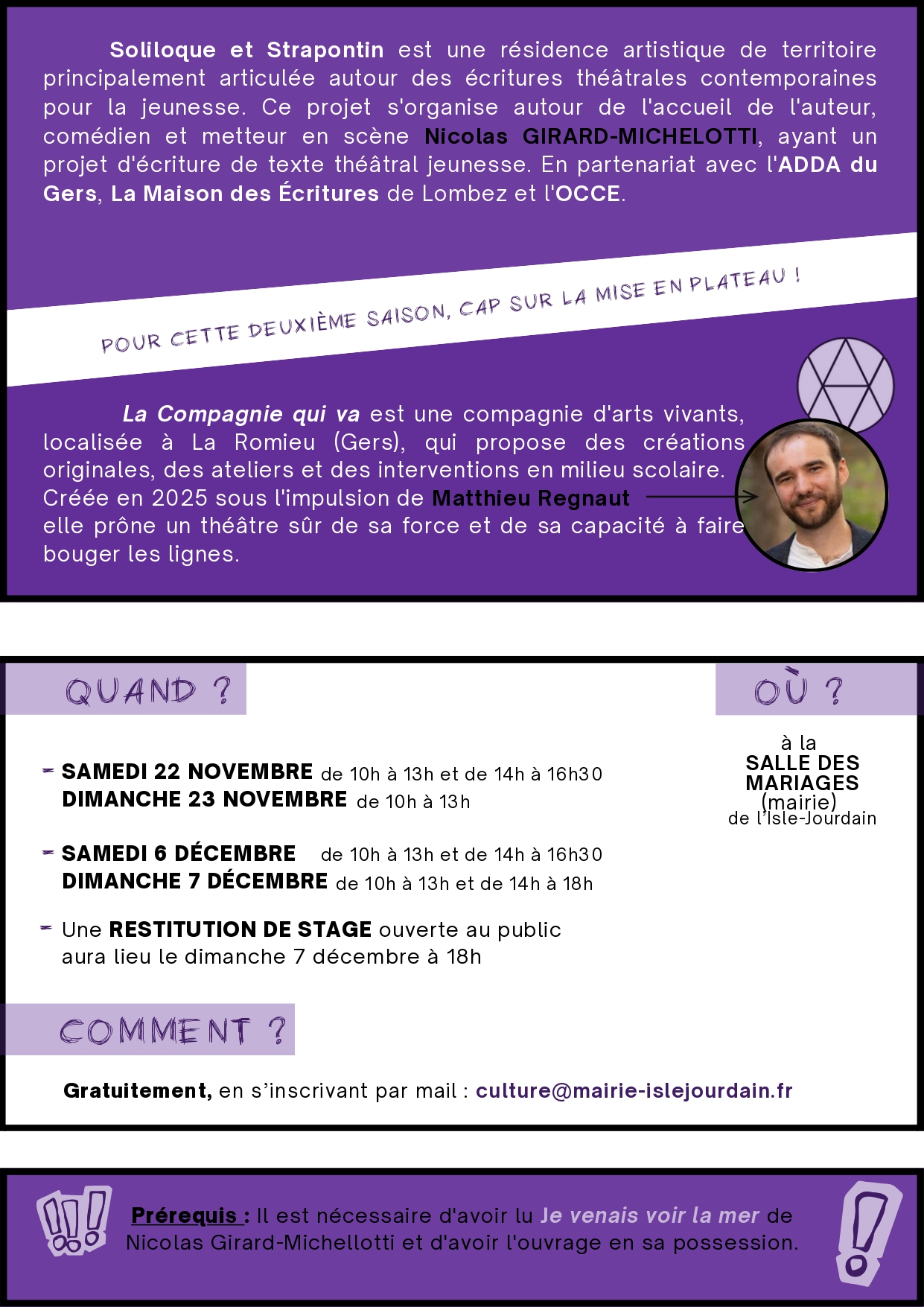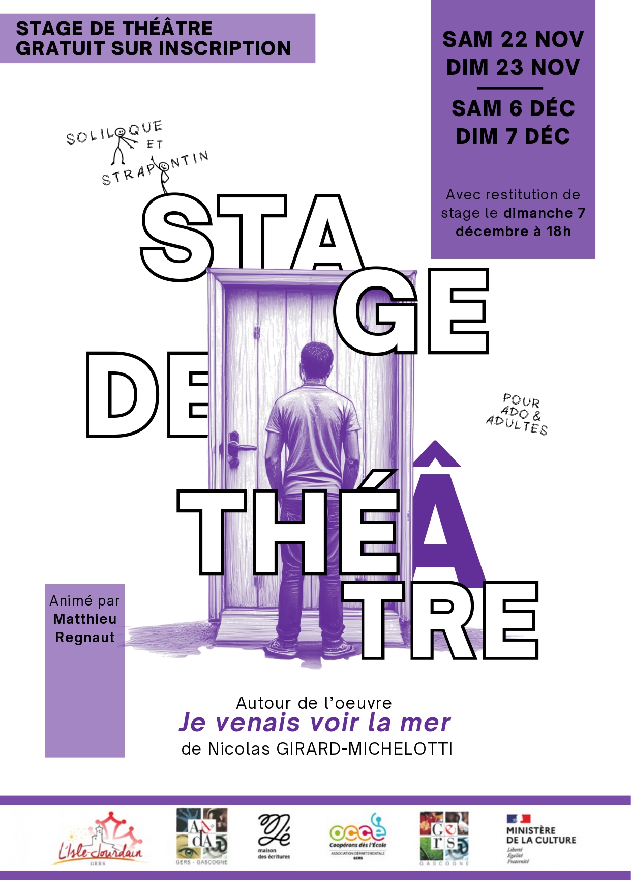 Ce projet s’organise autour de l’accueil de l’auteur, comédien et metteur en scène Nicolas GIRARD-MICHELOTTI, ayant un projet d’écriture de texte théâtral jeunesse. En partenariat avec l’ADDA du Gers, La Maison des Écritures de Lombez et l’OCCE.